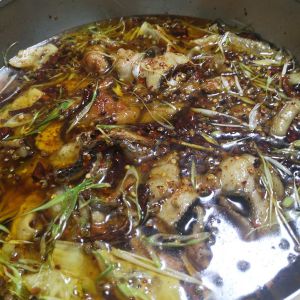 起锅烧油500克(多放油,油温二次加热),凉油放花椒和藤椒变色放辣椒
