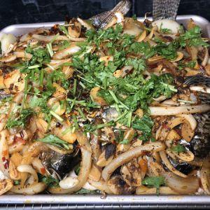 烤盘铺上锡纸,刷一层油,腌好的鱼放入烤盘,烤箱中下层,上下火230度烤20分钟,再调成上火继续烤10分钟