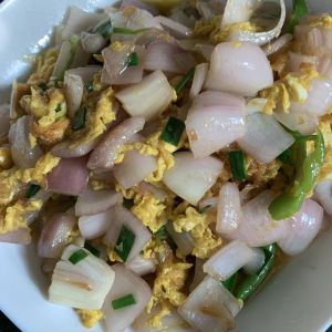 锅内放入少许油,下蒜片爆香加入青椒洋葱炒熟