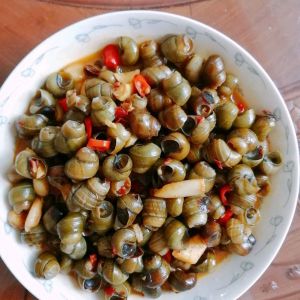 倒入田螺翻炒,加入料酒,盐大火继续翻炒。