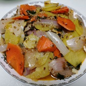 最后加盐调味,出锅。好吃简单的孜然土豆片就做好了。家里有小朋友,老人都可以做这道菜,营养比较均衡,土豆,胡萝卜,洋葱都有,还有孜然辣椒助攻,吃起来比较香促进食欲,补充了维生素。