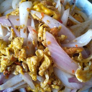 把鸡蛋打均匀,然后起锅下油,把鸡蛋先炒好,然后倒出鸡蛋在放一点油把洋葱炒到半熟,再到入炒好的鸡蛋,放入辣椒盐和均匀,放入一点水煮开