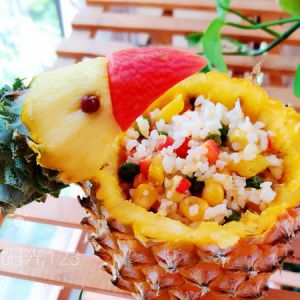 放入隔夜饭,压平隔夜饭,炒散隔夜饭颗粒分明,因为豌豆之前煮熟了所以翻炒一会儿就好了,最后放入菠萝炒一会儿起锅。