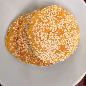 把所有面粉都揉成小圆球状,然后压瘪,小饼就做好了,再沾上芝麻(或者面包糠)