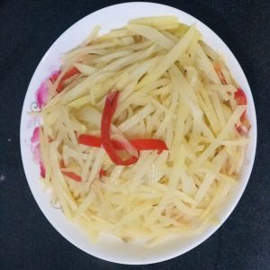迅速放入土豆丝,放白醋,大火翻遍3分钟左右