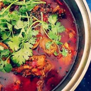 加开水及炒过的辣椒花椒,没过鸡,煮沸。加盐和鸡精调好味。