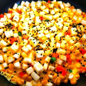 鸡蛋液通过漏勺均匀的渗透到馒头丁和杂菜的缝隙中,出锅前撒上黑芝麻。