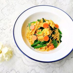 锅中再放少许油,放入韭菜梗和火腿肠炒一会