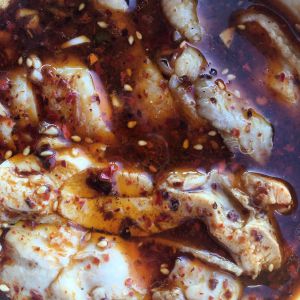 将蒜切成末放入碗中,依次加入生抽,醋,盐,味精、糖、香油,麻椒油、花椒粉和鸡汤、辣椒油,我喜欢麻椒味,又加了少许花椒水。