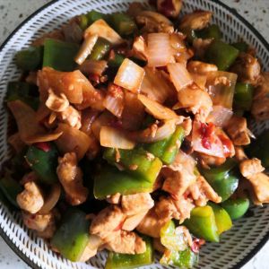 锅中加油烧热加入腌制好的鸡肉丁翻炒至变色,加入青椒和洋葱变熟,最后加入豆瓣酱和郫县豆瓣酱翻炒均匀即可