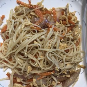 煮面的同时可以炒菜,面煮5分钟后捞出过水沥干待用。先炒胡萝卜丝,出黄油后倒入洋葱鸡蛋混合物翻炒,鸡蛋熟后加生抽,白胡椒粉,2克盐继续翻炒均匀,然后加入面翻炒均匀后出锅即可。