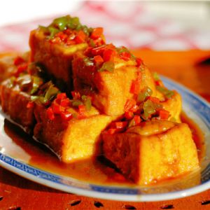 将豆腐切成厚度约3厘米、长约4厘米、宽约3厘米的豆腐块。