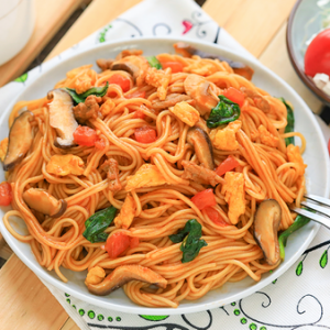 最后倒入香菇片、猪肉丝、青菜,鸡蛋和面条,用锅铲翻炒5分钟。