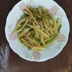 放入土豆丝和青椒丝,翻炒至土豆丝呈半透明状,放入白醋精盐翻炒片刻即可。