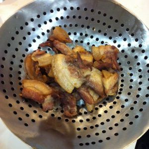 猪肉整块煮熟,切成厚约2mm的大片入油锅炸制,炸到金黄捞出.