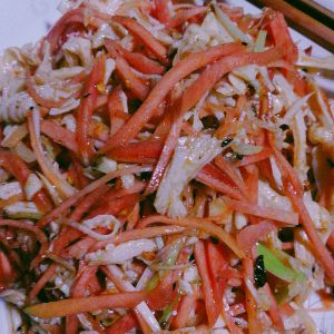 葱切丝备用,也可以跟胡萝卜一起码一下,如果觉得生葱味道有点刺激的话