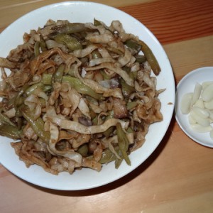 五花肉切成小指粗的条,扁豆择去老筋洗净。