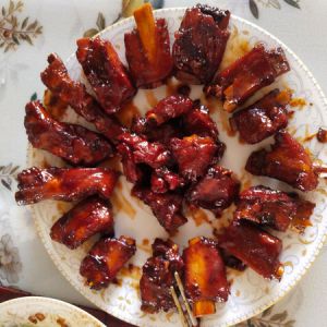 锅中放油,放冰糖,炒制变黄色,下如排骨快速翻炒至所有排骨都上糖色,再加温水或者凉水,没过排骨,加入之前煮排骨时用的香叶八角,放入少许新葱段和姜片,放一点老抽提色,放少许耗油,海鲜酱油两匙,生抽一匙,盐半匙,大火入味,收汁即可。