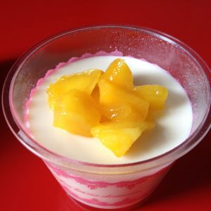 过滤后的牛奶分装后冰箱放置4小时,凝固后把颗粒芒果放表面就可以了!