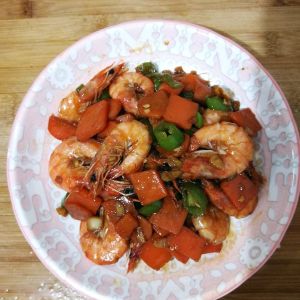 虾洗净去虾线胡须,胡萝卜线椒蒜洗净备用