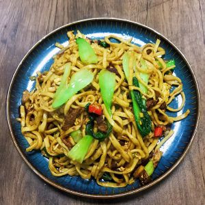 4.锅内放适量油,烧热后煸炒肉丝,煸炒好后盛出备用,继续加适量油烧热,下鸡蛋炒碎,➕洋葱炒香,➕小油菜、泡椒和小米辣爆炒1分钟,把肉丝倒进去,翻炒之后加入面条,依次加入老抽,生抽,白糖,蚝油,盐爆炒3分钟,出锅前加入鸡精翻炒,成品就搞定啦!