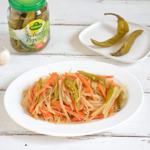 土豆和胡萝卜切丝,冠利腌绿辣椒切小段、蒜瓣切末…