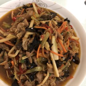 锅里放适量油,油六成热时把腌制好的肉放入,翻炒变色后加入葱姜蒜泡椒煸炒出香味,再把笋丝 木耳 莴笋 胡萝卜丝加入翻炒均匀,最后淋上鱼香汁翻炒均匀,出锅前放入葱花即可