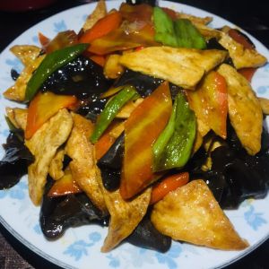 木耳控干水分(要不容易爆),放入木耳辣椒翻炒几下,倒入煎好的豆腐片