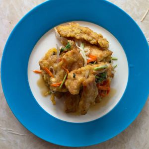 放入胡萝卜丝葱丝肉片翻炒,使每片肉均匀的裹上糖醋汁撒上香菜段出锅
