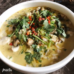 鱼片下进去一般2分钟就可以出锅了,这个时候再把剩余的调料放在上面,然后再用油锅,拉一点直接到在上面,超级好吃的酸菜鱼,全部都是鱼汤做成的