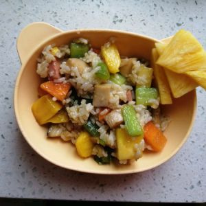 最后加入正好的米饭和切成块的菠萝翻炒,一分钟左右即可出锅,火腿也可换成炒鸡蛋,炒鸡蛋就要和菠萝米饭一同下锅.味道更佳!