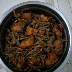 下姜蒜,花椒,八角,桂皮炒出香味,下生抽,老抽,料酒,盐,鸡精略炒,加入开水烧开(水要多,因为后面还要放干豆角,我用了家里的红水瓢满满一瓢)烧开后改小火慢炖45-60分钟。加入干豆角略炒,炖至收汁,最后收汁前可以加点耗油哦,不加也可以。