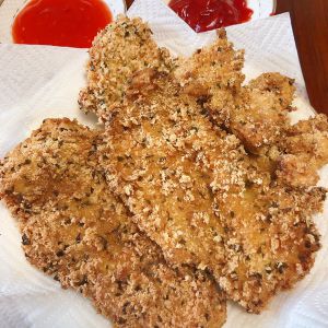 鸡排裹上淀粉,鸡蛋,面包糠,入锅炸,中小火,两面金黄出锅