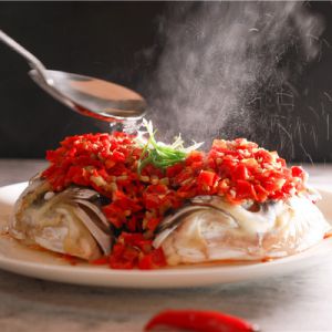 淋上些许豉油,放上葱丝,最后给鱼头淋上煮沸的热油即可。