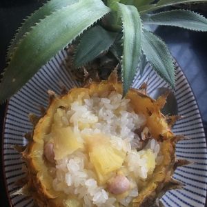 把泡了4小时的糯米和大米一起蒸,配上花生,枸杞,菠萝肉碎,冰糖,油(少量,根据爱好放搭配的食材)拌一起装进挖好的菠萝容器内再蒸几分钟 美美哒