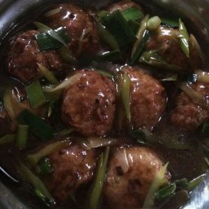 炸好肉丸,锅刷干净,在倒入油,大蒜切好,放入锅里翻炒在加入酱油,炒下,加入水,水滚了,在弄点生粉加进入锅里,在翻炒一下把汤汁倒在肉丸上了,就可以开饭了,