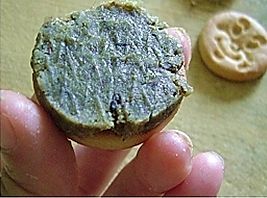放上一点绿豆沙(自制的,煮烂后用搅拌机打碎,炒制)