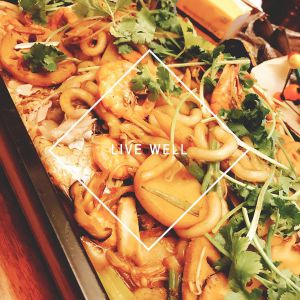 再将备好的虾、芹菜、菌类、豆芽、煮熟的手擀粉倒入锅中翻炒,加盐,少许糖,加一点水微炖2~3分钟至土豆绵软。起锅,将全部内容包括汤汁倒在烤鱼上,撒孜然。再入烤箱上下火200度5分钟。