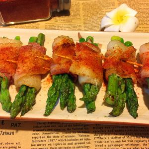 用培根把芦笋裹住定型,用牙签固定待用(其实不用牙签也行,培根受热变卷也可以达到定型的效果)