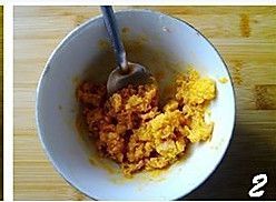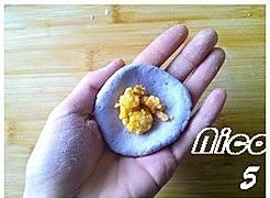 取一个小面团按扁捏平,放入1勺咸蛋黄;