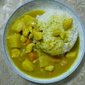 把除咖喱块外所有材料下锅炒,加入400ml水,等胡萝卜土豆用筷子能穿透,加入咖喱至其完全溶解