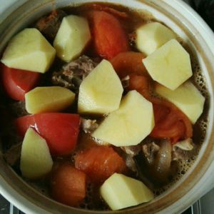 把炒匀的一起倒进砂锅,加热水!加热水!加热水!超过食材,烧开后撇去浮沫,转小火满满的炖。炖到牛腩快要酥烂之前加盐,收汤