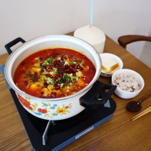 倒油,依次加入郫县豆瓣酱姜片火锅底料小火炒出红油再加热水,水开后稍微煮一会儿捞出渣子。