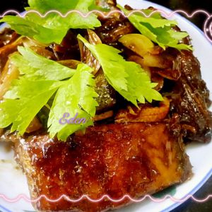 姜片和蒜用油炒香炒干,捞起姜片和蒜,将带鱼铺平在防粘锅里煎香、煎干,这一步一定要做到位,也是这道菜成功与否的关键之一。
