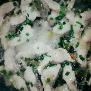 鱼片快熟时,加入葱花。好啦,我先吃喽