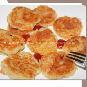 用勺子掏一勺土豆泥入不粘锅,慢慢火一边煎一边轻轻压扁煎至两面金黄即可;