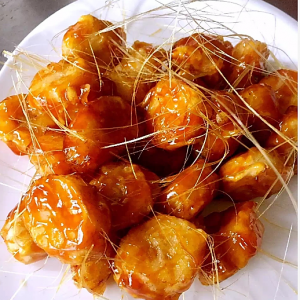 油温烧到六成,香蕉下油锅,炸到金黄拎起,待油温烧到七成,下锅复炸几秒钟,拎起待用