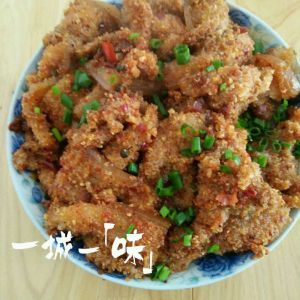我是买的现成的粉蒸肉粉,辣味的,用起来方便,不用再加其他的,里面有粉,有辣椒,