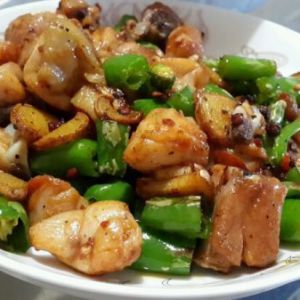 等汤汁快收干放入青辣椒翻炒,出锅前放入少量或者不放鸡精。