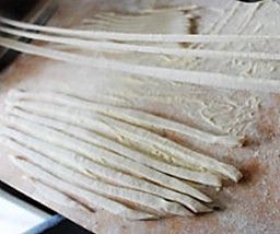 用刀将面皮等距切成条,这个条宽在0.5--1cm之间。把长条拉一拉,搓一搓,揉圆。可以用玉米面做干面,更不容易粘连。